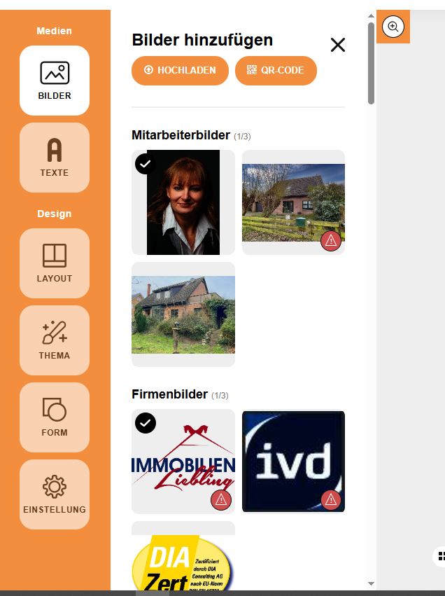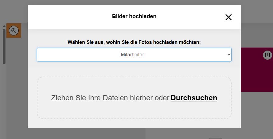 • Klicke auf „Bilder“ → „hochladen“ → Ziel „Entwurf“ wählen → „durchsuchen“ und gewünschte Bilder auswählen (Mehrfachauswahl mit STRG möglich).