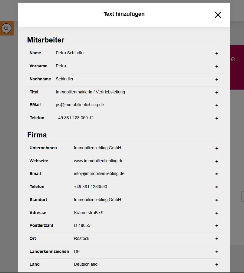 • Bei „Ihre Immobilie auf einen Blick“: Großes Bild einfügen und daneben die wichtigsten Objektdaten platzieren (über „Text hinzufügen“ und „Immobilie auf einen Blick“).